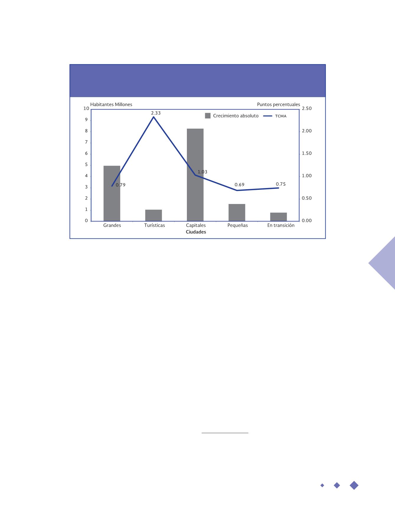 Crecimientoabsolutoy relativosegún tipodeciudad, 2010-2030